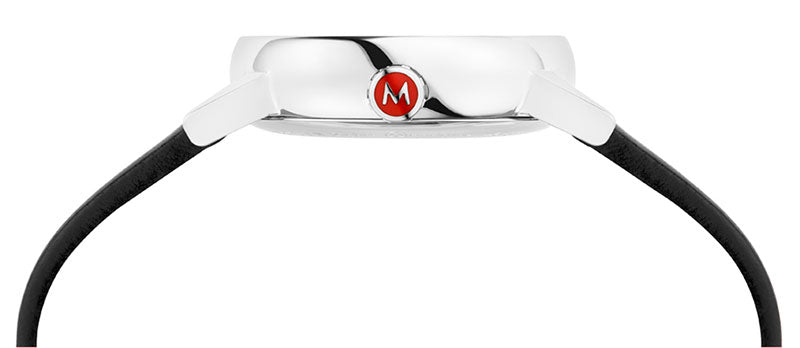 Dam Quartz Evolution2 , Ø26mm. MSE.26110.LBV, polerad helstålsboett med safirglas. Upphöjda index. Svart läderband med polerat spänne. Swiss made.